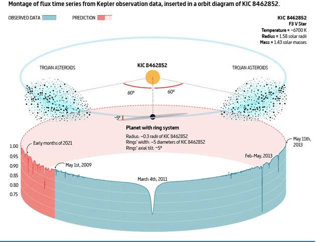 Wie das Team um Fernando Ballesteros von der katalanischen Universitat de València vorab via ArXiv.org berichtet, vermuten sie einen gewaltigen Ringplaneten und ganze Asteroidenschwärme, die diesem Planeten auf seiner Umlaufbahn vorweg und hinterhereilen – sogenannte Trojaner – als Erklärung für das Lichtmuster von KIC 8462852.