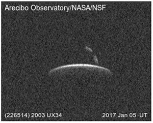 Ebenso wird anhand der Quelle deutlich, welches Objekt das Arecibo-Teleskop damals ins Visier genommen hatte: Den Asteroiden mit der Kennung „226514 (2003 UX34)“. Laut internationalen Referenzkatalogen handelt es sich bei diesem Objekt um einen erdnahen, potenziell gefährlichen Asteroiden der erdkreuzenden Apollo-Klasse. Mit einer Größe, die in etwa der eines Fußballfeldes entspricht, handelt es sich um einen vergleichsweise kleinen Körper dieser Kategorie (der größte, Sisyphus, hat einen Durchmesser von 8,5 Kilometern) der von einem noch deutlich kleineren (Mond) umkreist wird. Auch die 419-tägige Umlaufbahn dieses Asteroiden ist hinreichend bekannt und führt „2003 UX34“ im Jahr 2025 rund 18.491.650 Kilometer (ca. 45-fache Mondentfernung) an die Erde heran und damit aber in bequemer Distanz an dieser vorbei.