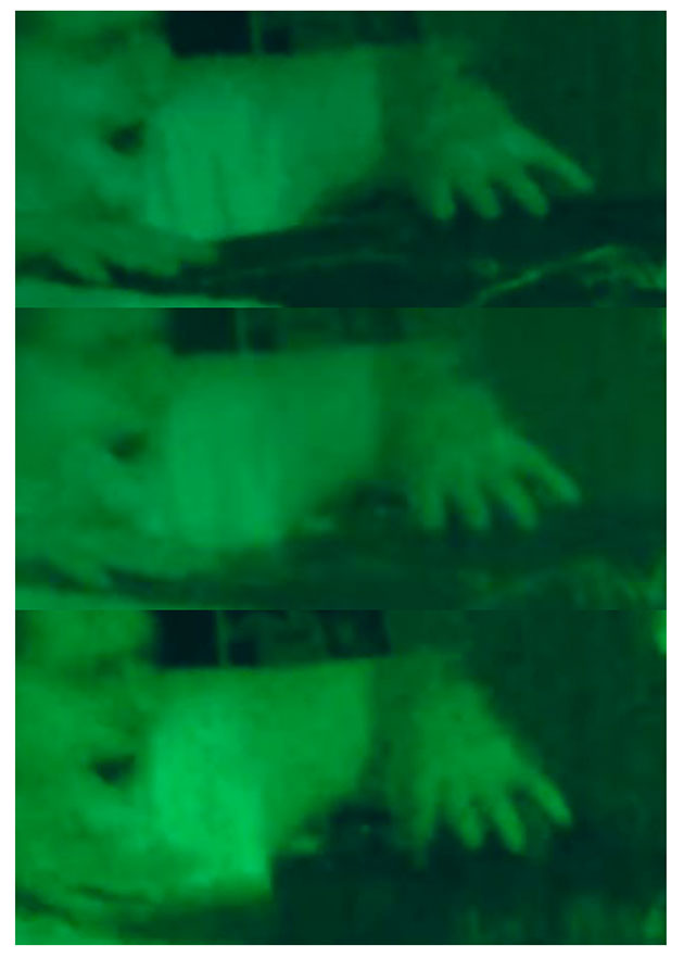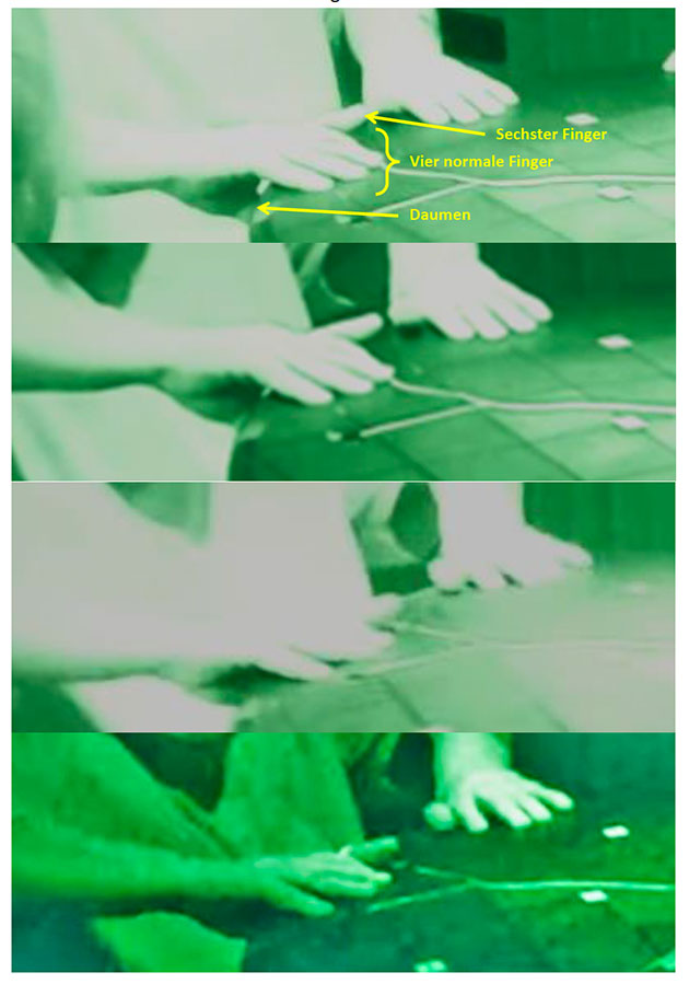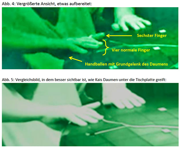 Wenn man genau hinsieht, erkennt man auf den nachfolgenden Standbildern einer Levitation in Braude (2014, S. 315), dass Kais Daumen nicht zu sehen sind, obwohl zumindest der rechte Daumen ansatzweise sichtbar sein sollte wenn er locker auf dem Tisch läge. Einfach mal selbst versuchen: Wenn ein Daumen locker neben den anderen vier Fingern auf einer Tischplatte liegt, sieht die Form der inneren Handkante ganz anders aus als auf dem letzten der drei folgenden Bilder. Die Form der sichtbaren Handkante sieht hingegen genau so aus, wenn jemand mit dem Daumen die Tischkante umgreift.