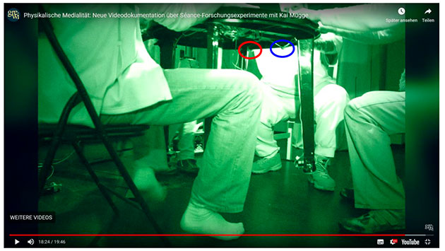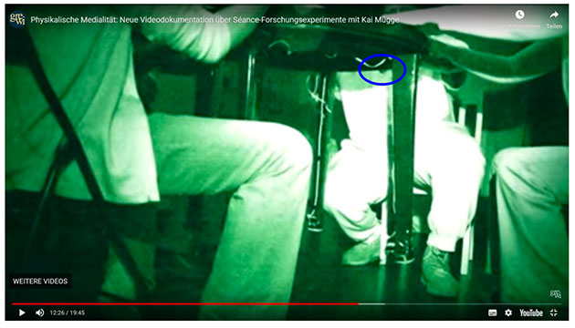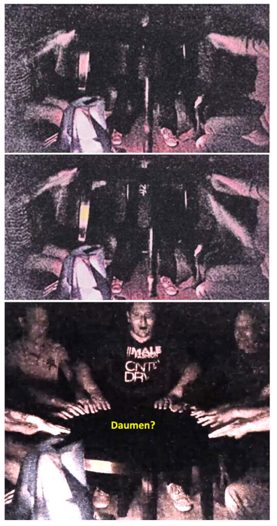Das Tischbein bei Kai befindet sich auch hier schon direkt vor seinem rechten Knie, und der Unterschenkel ist auffällig nach innen zur Körpermitte gewinkelt offenbar, um das Knie in Richtung Körpermitte zurück zu verlagern (Kais Füße stehen recht weit auseinander, damit sie im Kontakt mit den Füßen der benachbarten Sitzern sind). Und natürlich stieg der Tisch auch hier nicht höher als bis zu der Höhe, wo der unterste Teil des Tischbeins sein Knie noch satt berühren kann. (Fußnote: In einem anderen Video werden die für den zweiten Teil von Kruses Videodokumentation angekündigten Phänomene schon dargestellt (https://www.youtube.com/watch?v=x3lDxSNHYxY). Auch sie sind aus verschiedenen Gründen sehr betrugsverdächtig. Das Grundprinzip der künstlichen Hervorbringung dieser Phänomene (Schweben des Tamburins, Handformen über der Plaque) ist außerdem ziemlich einfach nachzustellen, was ich auch bereits getan habe. Mit etwas Übung sollte man solche Phänomene selbst unter den gezeigten Bedingungen problemlos auf künstlichem Weg erzeugen können.
