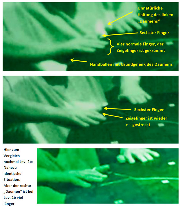 Weitere Abbildungen mit Vergrößerungen dieser und anderer Situationen der Levitationen 1, 2 und 3 folgen im Anhang. Dass Kai für die Levitationen 1 und 2 falsche Daumen eingesetzt hat, würde auch erklären, warum seine Hände an falschen Plätzen auf dem Tisch liegen und die Sensoren oft nicht einmal berühren: Er musste schließlich die falschen Finger aus ihrem Versteck holen und irgendwie an der Tischkante bei/unter seinen Händen anbringen. Möglicherweise hat er dabei die Sensoren nicht mehr gut wiedergefunden. Generell scheinen die Zeige- und Mittelfinger seiner Hände, die das Widerlager zum Daumengriff bilden, generell nur höchst selten richtig auf den Sensoren zu liegen. Es wäre durchaus interessant, einmal die gesamten Aufzeichnungen der Drucksensoren parallel zu den Videos der Levitationen zu sehen.
