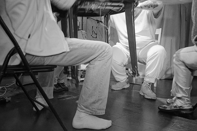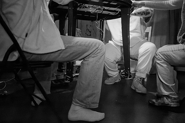 In einigen Kommentaren wurde vermutet, Kai hebe mit seinen Daumen den Tisch an, und es wurde vorgeschlagen, einen schwereren (Holz-)Tisch zu verwenden (d). Kurze Antwort aus der Einleitung: Bitte selbst ausprobieren! Bei seinen öffentlichen Tischséancen erläutert Kai regelmäßig, mit welchen Tricks sich Tischlevitationen fingieren lassen, z.B. werden an den Unterarmen versteckte Stahlstreben in den Tisch eingeklinkt oder ein Fuß unter dem Tischbein hebelt den Tisch hoch. Er lässt die Sitzer selbst versuchen, den Tisch irgendwie anzuheben. Danach fragt niemand mehr nach dem Gewicht des Tisches, weil klar ist, das geht so nicht – ganz zu schweigen davon, dass auch noch Hände der Sitzer darauf liegen. Wichtiger als das Gewicht ist übrigens das Drehmoment: Der Tisch hat einen Durchmesser von 84 cm. Ein Daumen, der 4 cm unter die Tischplatte ragt, müsste aufgrund des kurzen Hebels das Zehnfache der Gewichtskraft aufbringen, das entspräche 50 kg bei 5 kg Tischgewicht. Obendrein bietet der scharfkantige Rand des Tisches dafür keinen geeigneten Angriffspunkt. Falls überhaupt, ginge es theoretisch nur in Kombination von Daumengriff und einem permanenten, sehr gezielten Druck gegen ein Tischbein. Dass auch hier Daumenkräfte erforderlich wären, die deutlich größer sind als die Gewichtskraft des Tisches, erspare ich mir vorzurechnen (Stichwort: Mechanik, Statik, Freischneiden), obendrein erforderte es einen ausgesprochenen Balanceakt, zumal die Beine des Tisches glatt und abgerundet sind (Vorteil des Kunststofftisches). Wir waren bei den Experimenten sehr darauf bedacht, dass sich Hände, Füße, Beine von Kai und den Sitzern nicht an ‚verdächtigen‘ Positionen befinden oder wichtige Einblicke verdecken. Man kann sich immer mehr wünschen, aber acht Menschen- und vier Tischbeine wollen irgendwo untergebracht werden. Eine fragwürdig platzierte Daumenspitze war für mich ärgerlich, aber letztlich in der Summe des Materials nicht relevant. Hier drei weitere Aufnahmen, die in meinen Augen der Daumen-Bein-Trick-These deutlich widersprechen.