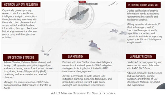 - „AARO erhält, speichert in Datenbanken und analysiert UAP-Meldungen, und AARO stellt den Interessenvertretern seine expertenbegutachteten (peer-reviewed) analytischen Schlussfolgerungen zur Verfügung.“