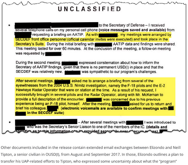 Weitere in der Veröffentlichung enthaltene Dokumente beinhalten umfangreiche E-Mail-Korrespondenzen zwischen Elizondo und Neill Tipton, einem hochrangigen Zivilisten im OUSD(I) [Office of the Under Secretary of Defense for Intelligence & Security], vom August und September 2017. Darin skizzierte Elizondo einen Plan zur Übergabe seiner UAP-bezogenen Bemühungen an Tipton, der jedoch gewisse Unsicherheit äußerte, was das „Programm“ überhaupt sei: „Irgendwann muss ich wissen, was das hier eigentlich ist‘.“