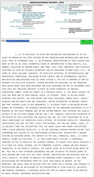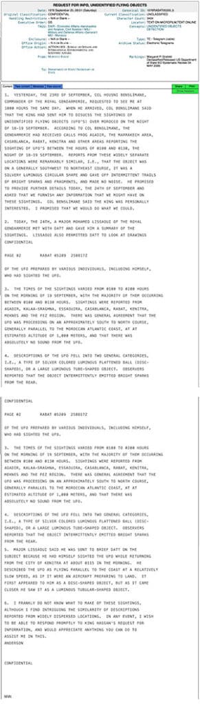 2013 veröffentlichte Wikileaks u. a. die sogenannten „Kissinger Cables“, eine Sammlung von 1,7 Millionen Dokumenten aus der Zeit von 1973 bis 1979. Aus dieser Sammlung gehen auch Depeschen zwischen der US-Botschaft in Marokko und Washington hervor, die sich ganz konkret mit dortigen landesweiten UFO-Sichtungen in den Morgenstunden des 19. September 1976, dem Interesse des marokkanischen Königs King Hassan II an den Ereignissen und deren Untersuchungen durch die US-Regierung befassten.
